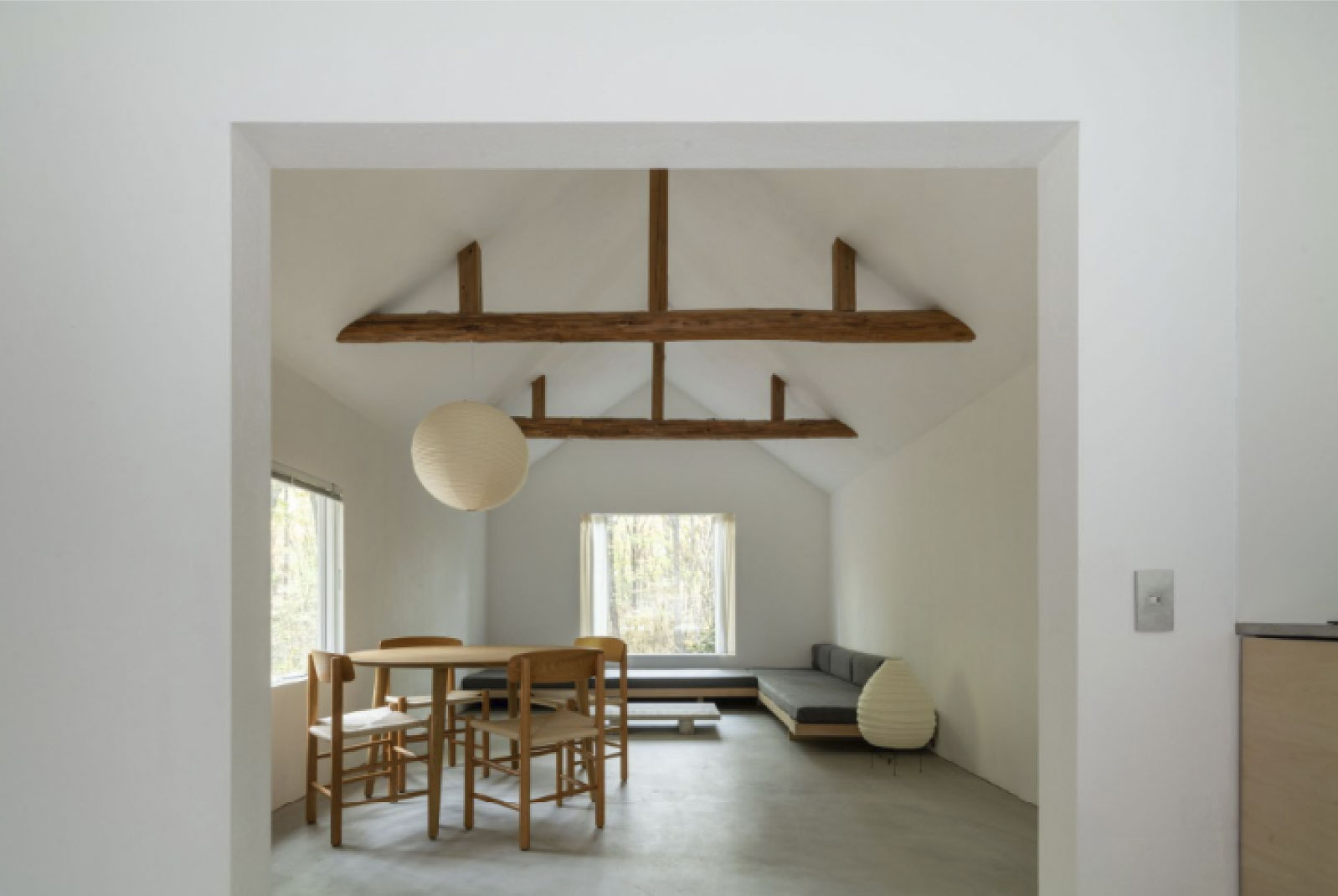 WHITE HUT は、私たちが設計した小さな宿です。設計の考え方を、実際の空間を通して体験していただく場として位置づけています。図面や言葉だけでは伝わりにくい光の質や距離感、時間の流れを、滞在を通して感じていただきながら、お互いの感覚を確かめる機会になればと考えています。